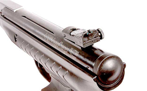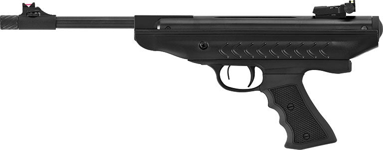 Hatsan-Druckluftpistole mit ergonomischem Design, Präzision und Manövrierfähigkeit. Gezogener Stahllauf, verstellbare TRUGLO-Glasfaservisierung, manuelle Sicherung und 11-mm-Zielfernrohrschiene. Strukturierter Griff.