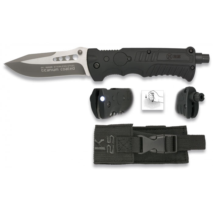 Martinez Albainox K25 19588 tactical knife with a 9 cm titanium-coated 7Cr17Mov blade, black SFL handle, and nylon MOLLE sheath. Includes a light, lug, and tungsten glass breaker. It features steel liners, a Liner Lock, and a weight of 147 g. Presented in a box.