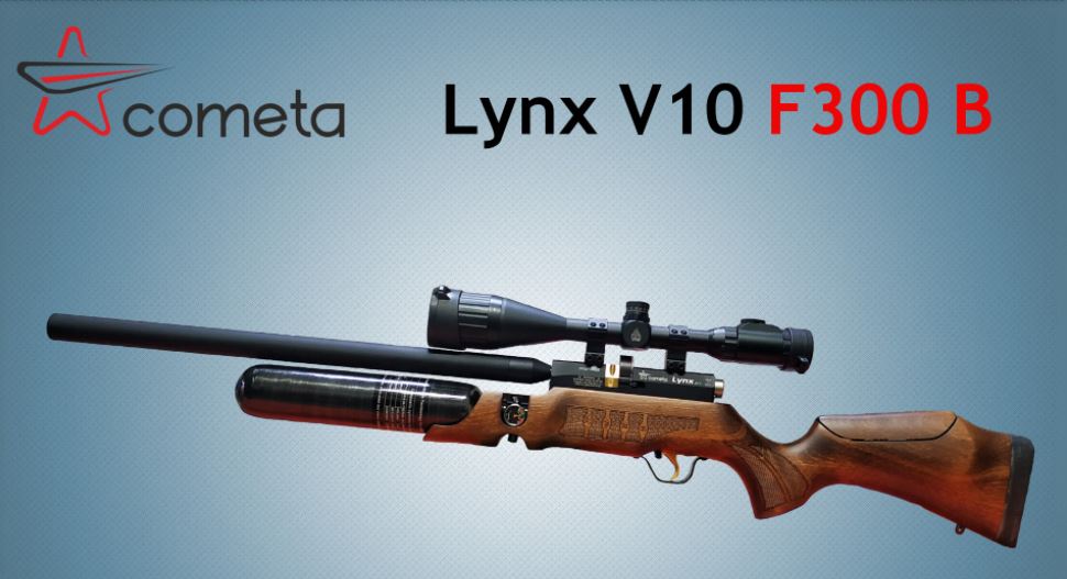 Carabine à air comprimé PCP Cometa Lynx V10 F300 B de Cometa, disponible en finition naturelle et désormais également en noir, avec la qualité Cometa et des caractéristiques imbattables. La V10 est équipée d'un double réservoir et d'un silencieux intégré.