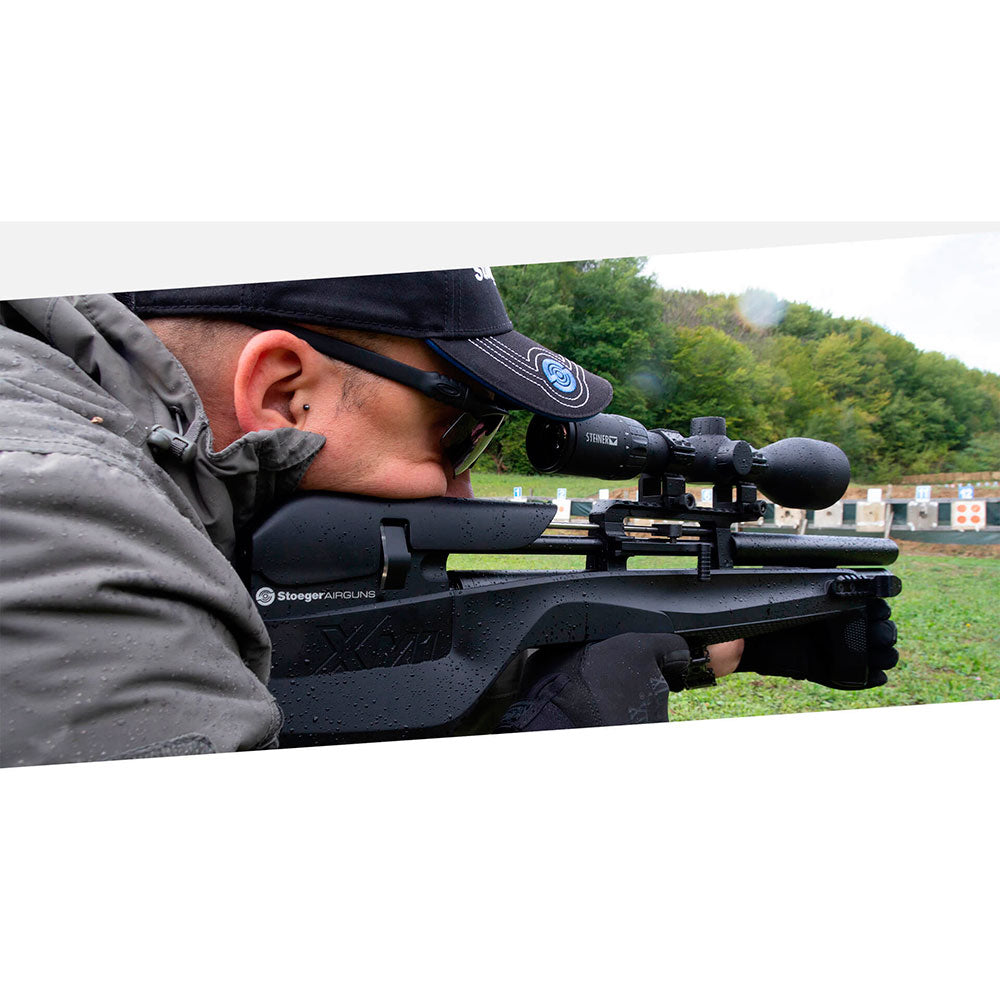 Stoeger XM1 Bullpup PCP-jachtgeweer met een compact Italiaans ontwerp, ergonomische kolf, Multi Grip System, roterende magazijnen, geïntegreerde regulator en hoge nauwkeurigheid. Lichtgewicht, terugslagloos en perfect voor krappe ruimtes en dynamisch gebruik.