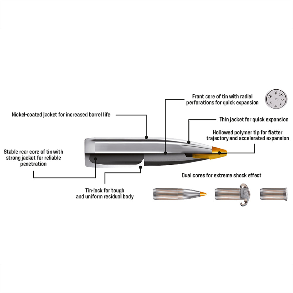 Núcleos duales: La parte frontal de la bala está diseñada con perforaciones radiales para una rápida expansión tras el impacto. La parte trasera de la bala es una parte central sólida que penetra huesos, piel y otros obstáculos difíciles en el camino.